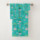 Pretty bath towel set with a 1950's, atomic pattern on turquoise. Geometric, ovals, boomerang, abstract shapes in black, white and yellow.