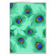 Note card in a drawing of peacock feathers, enhanced and rendered in a soft conte crayon effect - turquoise / peacock green, with rust and cobalt blue eye, on a pastel aqua background