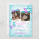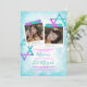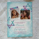 Unique teal, pink, and silver glitter Bat Mitzvah invitation with hints of turquoise, blue, and purple gradients. Cute square photos with star of David artwork on soft turquoise watercolor is a beautiful vintage look for your birthday celebration. Photo captions can be changed to any beautiful wording you choose. Easily upload your photos into the photo frames.
