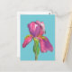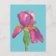 A floral post card decorated with a pretty pink and purple iris flower drawn in black ink and painted with watercolor in several shades of pink and purple with olive green for the stem on a turquoise blue background. You can change the background colour to fit your needs.