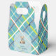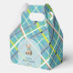 Celebrate in style with this charming baby boy shower favour box featuring a sweet teddy bear adorned with a soft blue ribbon, nestled within a playful arch design. The front showcases a fresh turquoise blue plaid background accented with lime green, white, and orange for a modern twist on a classic pattern.