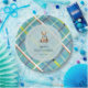 Celebrate in style with this charming baby boy shower paper plate featuring a sweet teddy bear adorned with a soft blue ribbon, nestled within a playful arch design. The front showcases a fresh turquoise blue plaid background accented with lime green, white, and orange for a modern twist on a classic pattern.
