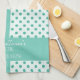Turquoise and white polka dotted pattern with accent stripe personalised kitchen towels. Personalise all text as you desire. Click "customise" to resize text or change font styles.
