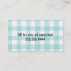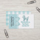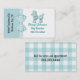 Cute dog themed business card made with a turquoise and white background, with graphics of a turquoise and white gingham ribbon and bow between the two colours. Graphics of a sweet fluffy looking turquoise poodle decorates the top white side of the card, with custom turquoise text under it. Dark grey custom text runs sideways, on the turquoise side of the front. A turquoise and white chequered pattern, on the back of the card matches the ribbon and bow, on the front, and the custom grey text is ready to personalise. Personalise this fun card for your business.