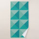 This towel set has a bath towel with a geometric design of triangles that form squares that look like a bird's eye view of pyramids, a washcloth indark turquoise, and a hand towel in lighter turquoise.