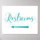 Wedding restrooms sign in turquoise with an arrow pointing to the left.
