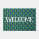 This doormat has a mid-century modern design of ovals in teal with semi-circles in green and navy inside them on a field of turquoise.