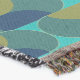 This throw blanket has a mid-century modern design of ovals in teal with semi-circles in green and navy inside them on a field of turquoise.