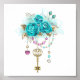 Antique gold key with trendy turquoise roses decorated with leaves of white gold and pink and blue beads. Fashionable colour. Turquoise roses. White gold. Blue tiffany.