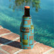 This bottle cooler has a mid-century modern design of rounded rectangles in shades of green and brown with holes in them on a field of turquoise. If you like the design but prefer different colours, message me.