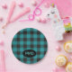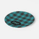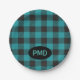 Turquoise Teal Blue Black Buffalo Plaid Monogram Paper Plate
