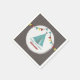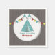 Birthday party napkins featuring an illustration of a turquoise chevron tipi and bunting over a wood inspired background.