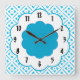 This is a pretty clock with a turquoise and white floral stencil background, and a scalloped edge white and turquoise layered field for the easy to read numbers.