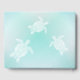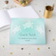 This lake house guest book feature a coastal design in soft colours, white turtles on a soft shiny turquoise background.