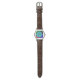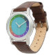 A pretty design with a  turquoise centre  and multicolored border. Lemon orange numbers and a tan leather band  complete this clock design. Customise to change to a different ladies watch.