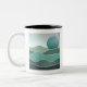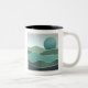 This fantasy landscape is in beautiful textured layers and shades of turquoise and aqua with a sun and hills and mountains.