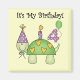 A cute green smiling turtle wearing a party hat carries a lit birthday candle on his back and text reads "It's My Birthday". A helium balloon carries the number 4!