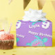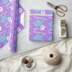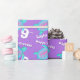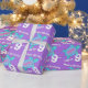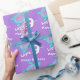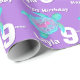 Birthday wrapping paper in bright purple with a swimming whimsical sea turtle design. Personalise this turtle art birthday paper with your child's name and age. Currently reads Happy Birthday Layla 9 today. Ideal for young turtle or sea creatures or wildlife fans. Design and cute heart shell turtle painted in watercolor by Sarah Trett.