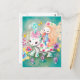 Little redhead elf girl with long soft orange hair, accented with a pink rose, dressed in a blue dress and blue leggings, having a fun turtle ride! The magical turtle is white, with green spots, and her shell has pink roses on it. She wears a big pink bowin her hair (she IS a magical turtle after all). Spotted mushrooms and bright flowers enhance the garden palyround, and yellow butterflies flit about.