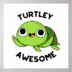 Turtley Awesome Funny Turtle Pun features a cute turtle waving at you and flashing a turtley awesome smile. Funny Pun gift for family and friends who love totally awesome turtle puns.
