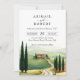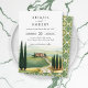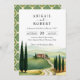 Watercolor Tuscan landscape with a villa and cypress Tuscany Italian tile destination wedding invitation. Infuse your wedding with the romance and charm of Tuscany, Italy, through this stunning watercolor invitation. The scene depicts rolling green hills, cypress trees, and a classic villa with terracotta roof tiles, reflecting the region’s beauty in an artistic, dreamy way. A winding countryside road adds a touch of wanderlust, leading your guests into the idyllic setting of your wedding celebration. The back features geometric Mediterranean tiles, enhancing the invitation’s elegance. This scenic illustration is a representation of Tuscany’s essence rather than an exact depiction.