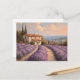 This enchanting landscape artwork features a winding path through blooming lavender fields leading to a rustic stone cottage with a red-tiled roof. Set against rolling hills and a pastel sky, this romantic countryside scene evokes the charm of Provence or Tuscany