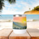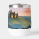 Artistic travel wine tumbler features an AI generated digital watercolor scene of a beautiful sunset over rolling hills in a valley in Tuscany, Italy.