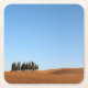 Coaster with a small group of cypress trees in a small forest between the rolling barren hills in autumn in the Val d'Orcia, Tuscany, Italy. Panoramic print, great for home decoration above a sofa.