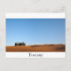 Postcard of a small group of cypress trees in a small forest between the rolling barren hills in autumn in the Val d'Orcia, Tuscany, Italy on a white background and the text: 'Tuscany'.