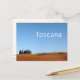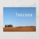 Postcard of a small group of cypress trees in a small forest between the rolling barren hills in autumn in the Val d'Orcia, Tuscany, Italy and the text: 'Toscana'.