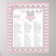 Cute bird with party hat and pink tutu jumper, booties, and diaper on clothesline with 3D-look polka-dot bow and grey and white chevron print with pink accents baby shower seating chart poster.