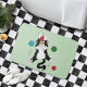Black and white tuxedo cat falling with Christmas ornaments in a backdrop of green. Hang In There this Holiday Season.