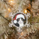 Black and white tuxedo cat wears a Santa hat with a Christmas tree in the background cat lovers cute holiday snowflake ornament