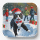 Tuxedo Cat Running in Snow with Christmas Hat Paper Plate