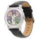A cute black and white bicolored cat, European Shorthair, sitting on a wooden chair in front of violet garden flowers. Photo taken by Katho Menden. This watch is a gift idea for cat lovers.