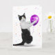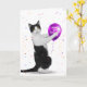 Black and white cat with purple balloon and confetti on white background for 13th birthday.