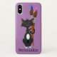 Black and white tuxedo cat sitting up with a happy smile in his face. His tail is curled around two artist paint brushes, one with pink paint and the other with blue. Below is a template in black text to add your name to personalise this fun phone case.