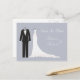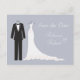 Tuxedo and Gown on a silver blue background Wedding Save the Date Postcard