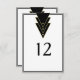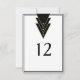An elegant table number card with simplistic elegance, this design features an art deco inspired geometric pattern of black repeating triangles bordered in gold with simulated gold studs. Enter your table numbers by replacing the sample numbers shown on the front and back of this card. You can add additional text if you wish to include names or other information regarding your event. This card comes in several other sizes to accommodate your needs.