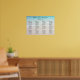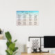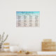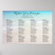 Wedding seating chart poster with beach theme. Seat guests by table number. Beach sand background with tropical blue water along the top. Married names at top in elegant and modern, hand-written font with one or two lines for date and location of celebration. Each of the twelve table number sections has room for up to eight guests, or list fewer as needed. Tables are listed horizontally, but that is easy to change by changing the numbers using the templates. For fewer tables, simply delete sections as needed, keeping the look symmetrical. Also download this design to print your own.