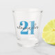 Personalised 21st birthday shot glass with blue age text and modern script name. Colours and fonts can be changed if required.
