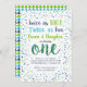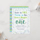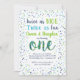 This first birthday invitation is perfect to celebrate your twin boy's big milestone. The invitation reads 'Twice as Nice, Twice as Fun, (Names), are turning One' surrounded by confetti in navy, teal, and green. Custom colours and wording are available upon request.