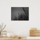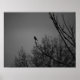 This poster features a lone bird on tree branch against skyline in black and white