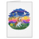 A star shines down on a Blenheim Cavalier King Charles Spaniel enjoying the twilight as the sun starts to set, the moon rises in the sky of swirling colours and a dove hovers overhead.