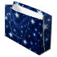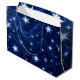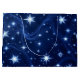NIght sky filled with glowing stars and snowflakes in various sizes and styles. Set against a deep blue backdrop, the bright white and icy blue elements create a striking contrast. Wispy, wave-like light trails weave through the composition, adding motion and depth. The overall effect is magical and wintery—evoking a sense of wonder, serenity, and seasonal charm.