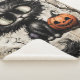 A scruffy black cat perches in quiet defiance, its oversized eyes reflecting the hush of dusk and the secrets it guards. Beside it, a jack-o'-lantern grins knowingly, casting flickers of orange across tangled branches and the ghostly flutter of a passing bat. The backdrop—a tapestry of aged paper and forgotten melodies—sets the stage for a night where enchantment curls in the corners and every shadow might purr.