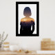 A striking double exposure digital artwork blending the silhouette of a young woman with a glowing Moroccan sunset, minimalist desert trees, and distant mountains—perfect for serene, modern interiors. Evokes twilight Moroccan landscapes, silhouette desert art, and a warm, ambient glow.