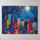 The artwork's charming details invite you to peer closer, to discover the subtleties and secrets hidden within this metropolitan canvas. Lanterns float skyward, adding a touch of whimsy and wonder, while the moon casts a gentle glow over the scene, uniting the disparate elements into a harmonious whole.