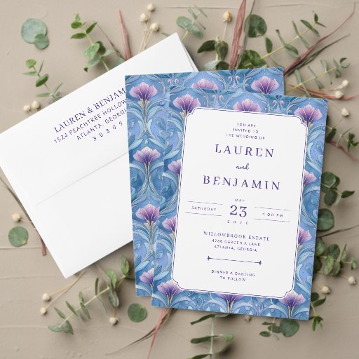This is a minimalist style image featuring an elegant wedding menu with a sophisticated and clean design. The menu showcases a variety of dishes, from starters to dessert, in a simple yet refined font against a soft blue background. It exudes a sense of warmth and celebration, perfect for capturing the essence of Lauren & Benjamin's special day on May 23, 2026. Ideal for couples looking to add a touch of class to their wedding reception.