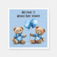 Cute twin baby boy teddy bears with blue balloons and bow ties on a white polka dot with blue background.